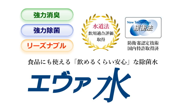 「エヴァ水」の除菌成分:次亜塩素酸は、厚生労働省にて食品添加物としても認可されている成分。